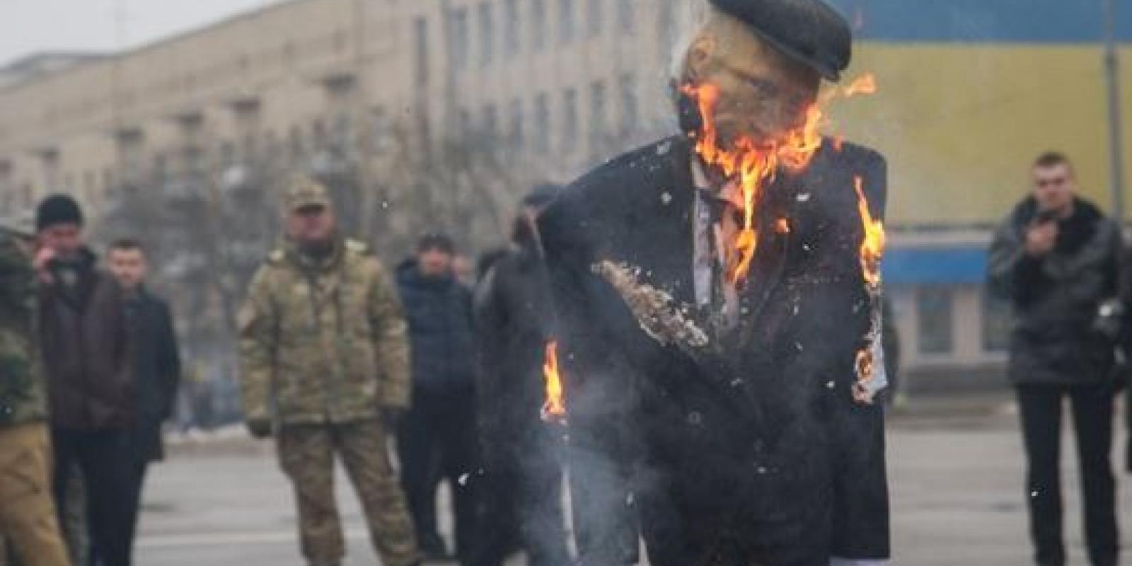 Врешті Путіна під вигуки "Гори у пеклі" та оплески натовпу запалили. Спочатку вогонь пошкодив кінцівки, тому опудало "впало на коліна". Залишки опудала загасили з вогнегасника, а потім його прибрали пожежники.