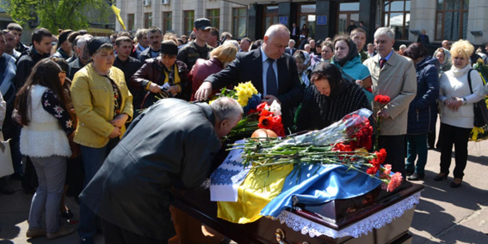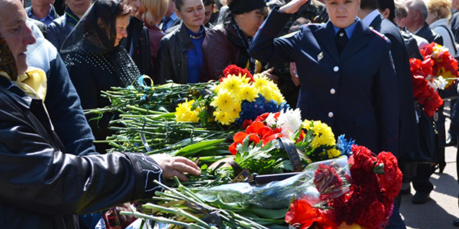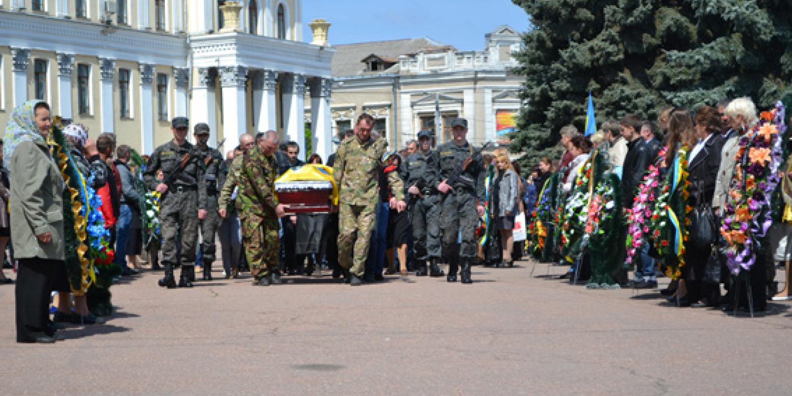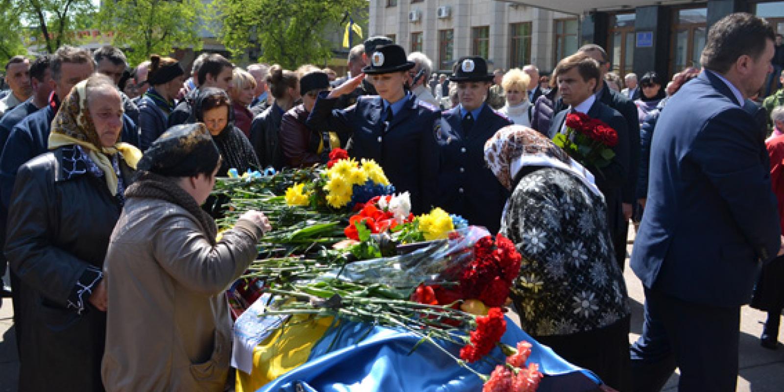 На центральній площі Житомира рідні, близькі, друзі, керівництво області, міста та регіонального УМВС України, а також пересічні житомиряни приклонилися перед загиблим героєм-земляком і урочисто вшанували його світлу пам'ять.