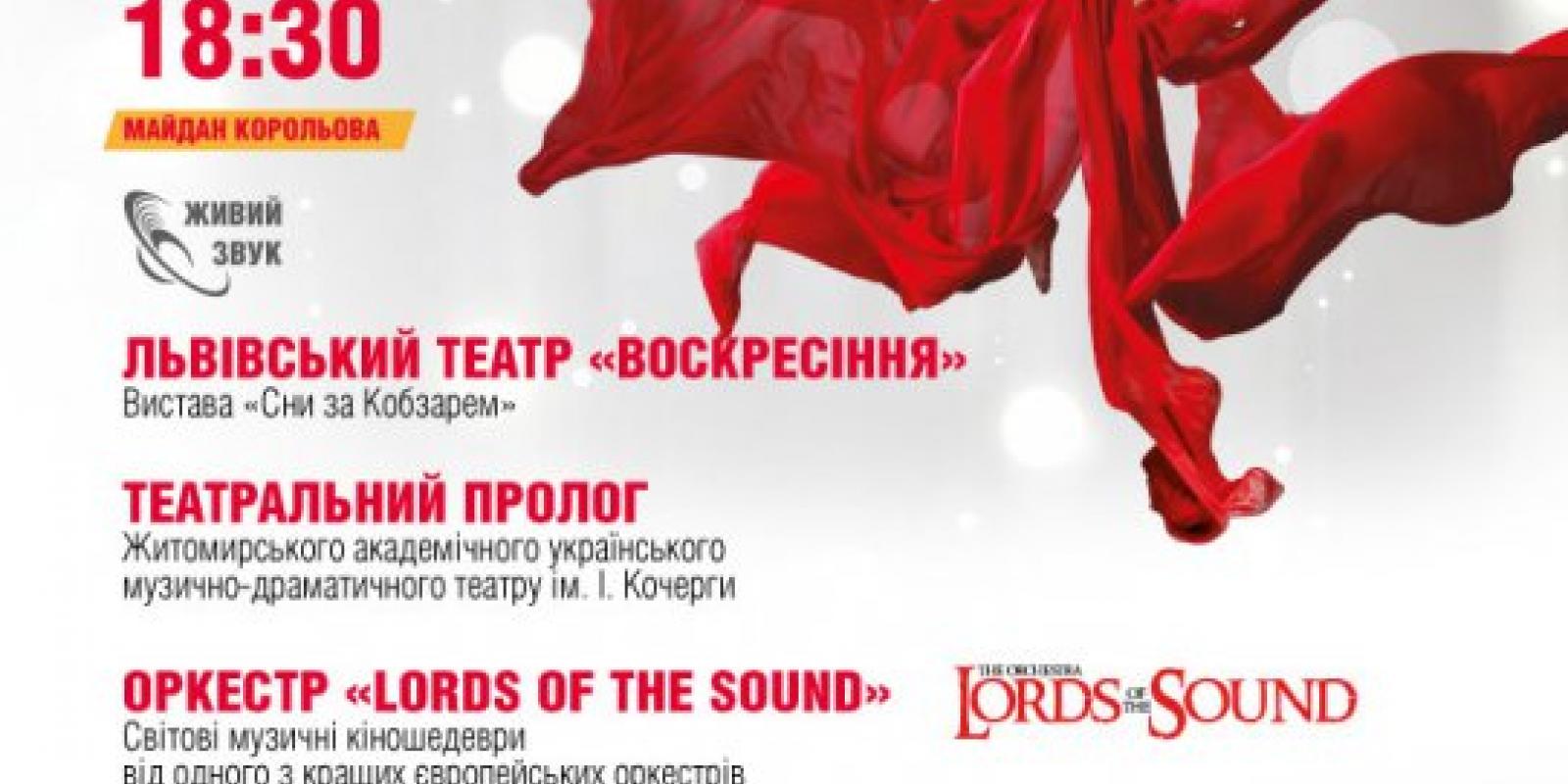 У програмі заходу: вистава "Сни за Кобзарем" у виконанні акторів Львівського академічного духовного театру "Воскресіння", театральний пролог від акторів Житомирського драмтеатру, світові музичні кіношедеври від одного з кращих європейських оркестрів – Lords Of The Sounds, спеціальний гість - Джамала та вогняне шоу від театру вогню "Махатма".