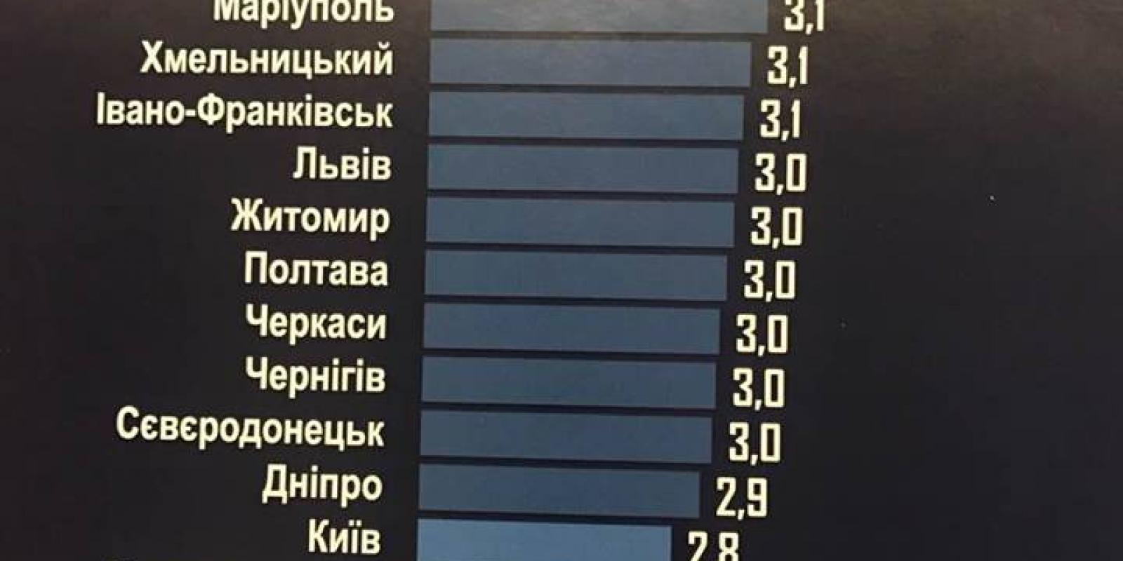 Вінниця, яка очолила рейтинг, також не дуже вгодила своїм мешканцям. Вінничани виставили лише три х половиною бали. Житомир поділив 10 сходинку з Полтавою, Черкасами та Львовом. До речі, останній минулого року був на третій сходинці та через сміттєвий колапс скотився додолу.