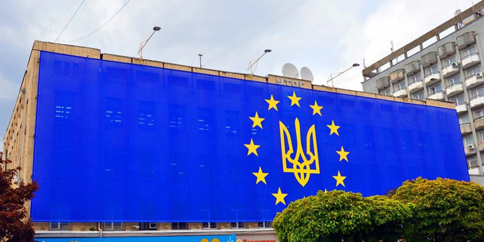 Прапор Європейського Союзу із зображенням Державного Герба України розміщений на фасаді будівлі за адресою: м. Житомир, вулиця Київська, 1, та має розміри 11,345 м Х 40,236 м.