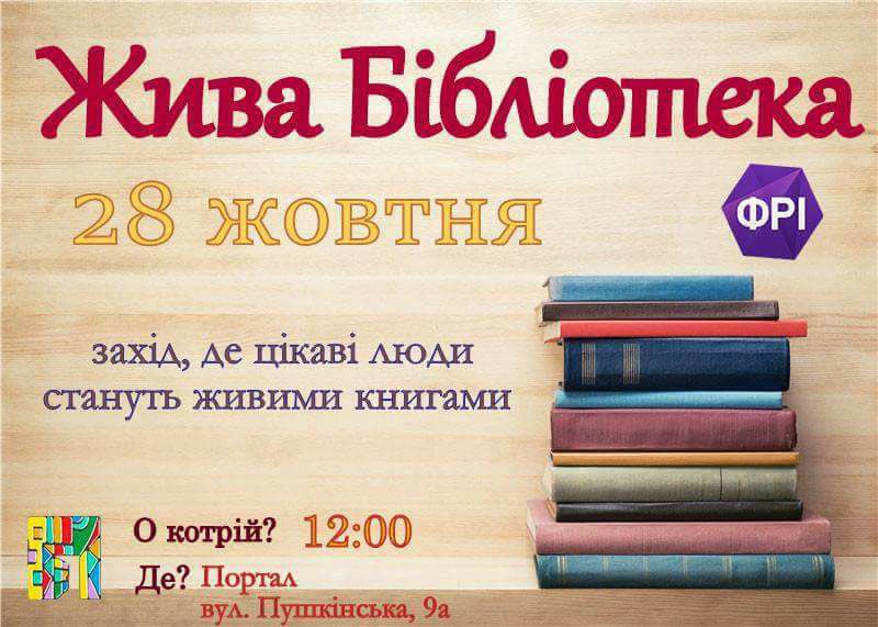 Арт-простір «Портал» влаштує Живу бібліотеку. Громадські діячі, поети, письменники і навіть бізнесмени читатимуть книжки. Ви будете переміщуватись від книжки до книжки, почуєте, як вони оживають. Зможете поговорити з усіма, кого раніше бачили здалеку.